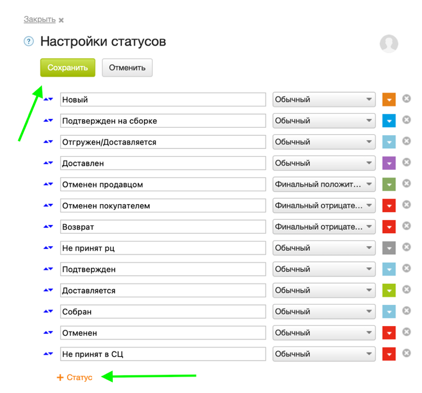В появившимся окне прописываем статусы, как на скрине ниже, в том же порядке и с такими же названиями. Для добавления статуса нажимаем + статус, когда все будет готово -кнопку сохранить.
