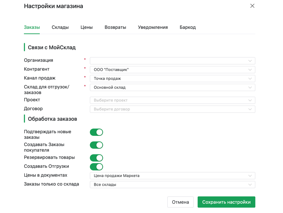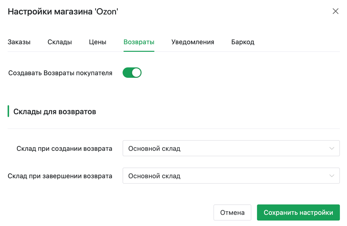 Перетягиваем рубильник «Создавать Возвраты покупателя» - это переключатель, который автоматизирует учет товаров, которые клиенты вернули на маркетплейс.