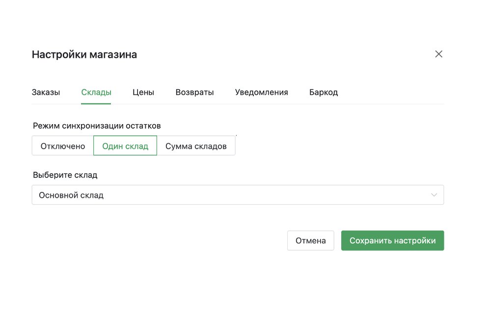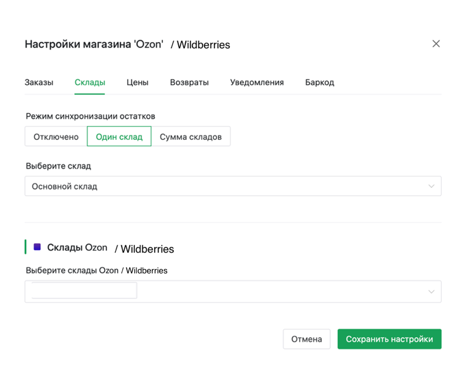 Пример №2: клиент оформил возврат товара. Он автоматически попадает на склад «Возвраты», но, если товар не нуждается в повторной перепроверке после получении возврата, указываем ваш основной склад. И после получения вами товара на ПВЗ он автоматически переместится на основной склад и встанет на продажу.