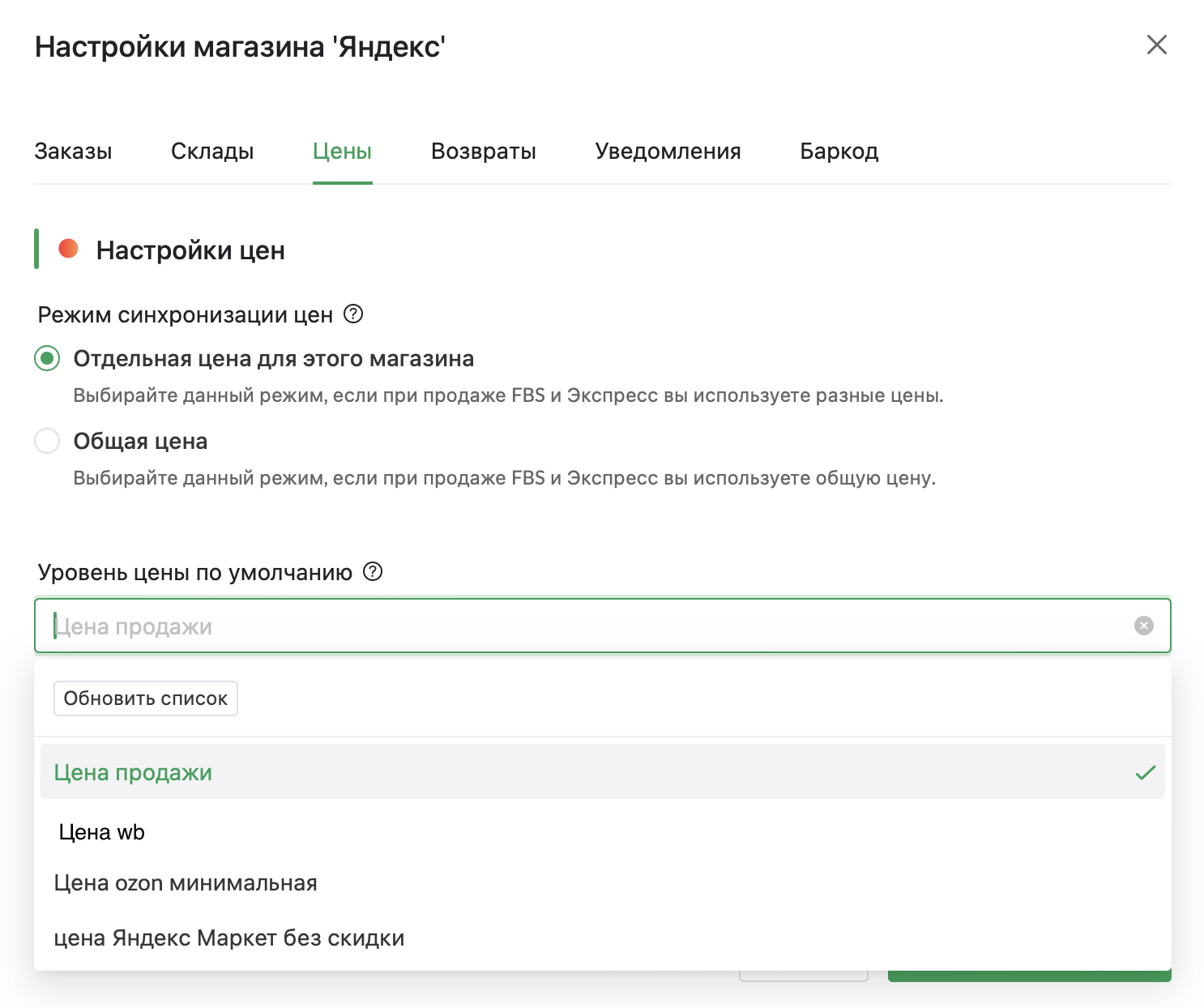 При выборе первого режима синхронизации, цена будет меняться только в той форме доставки (FBS или Экспресс), которую вы настраиваете.
