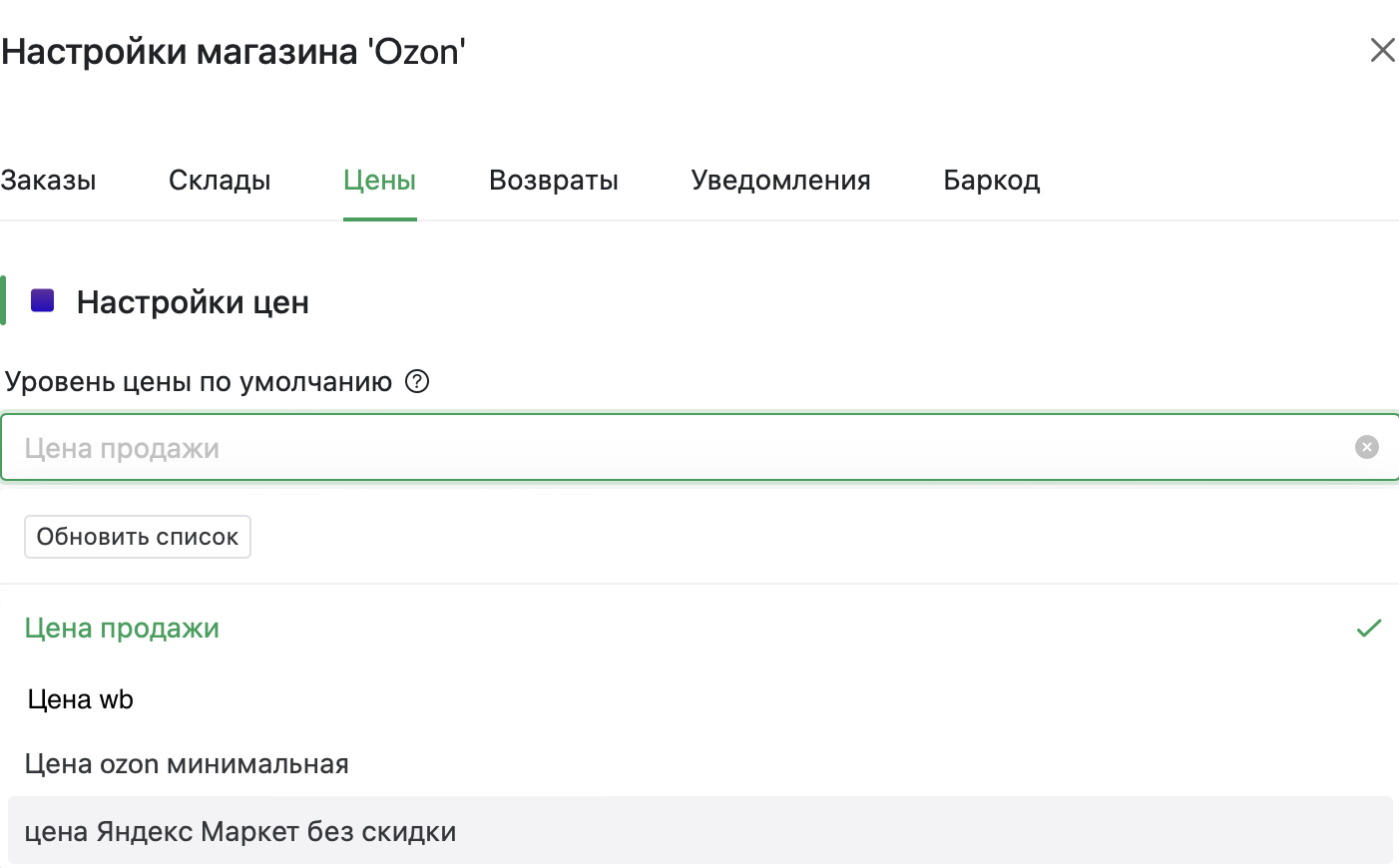 Поле «Уровень цены по умолчанию» – оставляем незаполненным, если хотим, чтобы цена транслировалась из основного поля «Цена продажи» для всех товаров магазина в МоемСкладе.