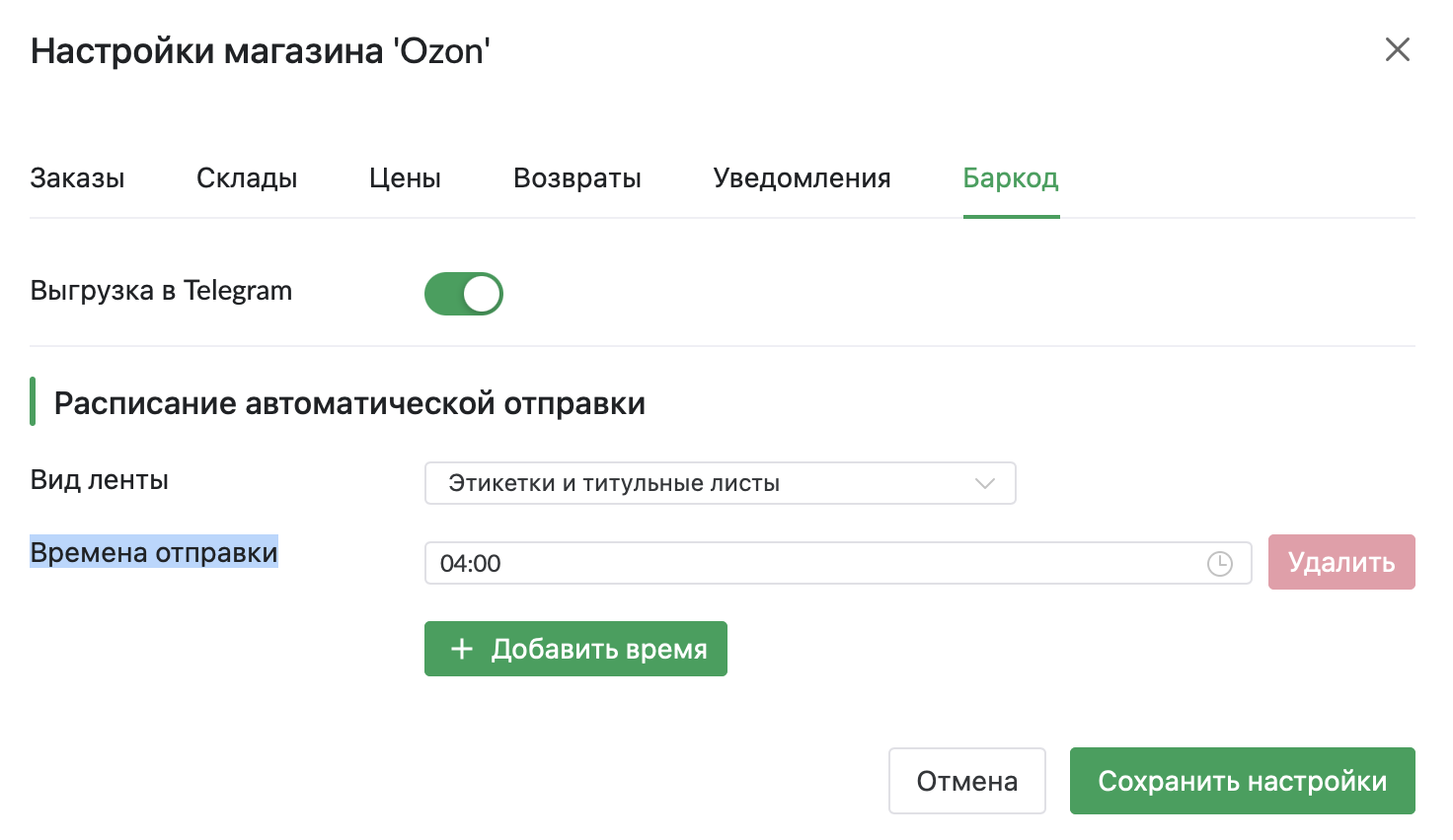 Рубильник «Выгрузка в Telegram» нужен для того, чтобы вы могли получать файлы для печати этикеток и титульных листов заказов прямо в мессенджер. Перетягиваем рубильник и выбираем Вид ленты, Времена отправки, которое вам подходит.