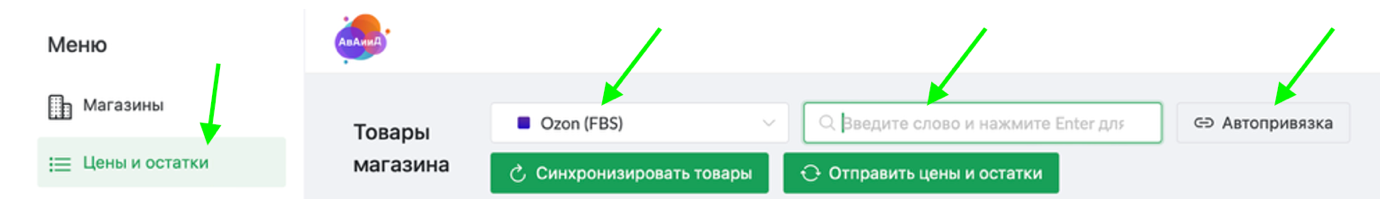 - Заходим в "Цены и остатки" → выбираем магазин/магазины (если их несколько), также можно по поиску найти нужный товар, который хотим привязать → нажимаем "Автопривязка".