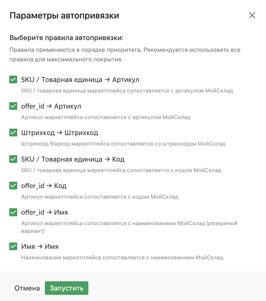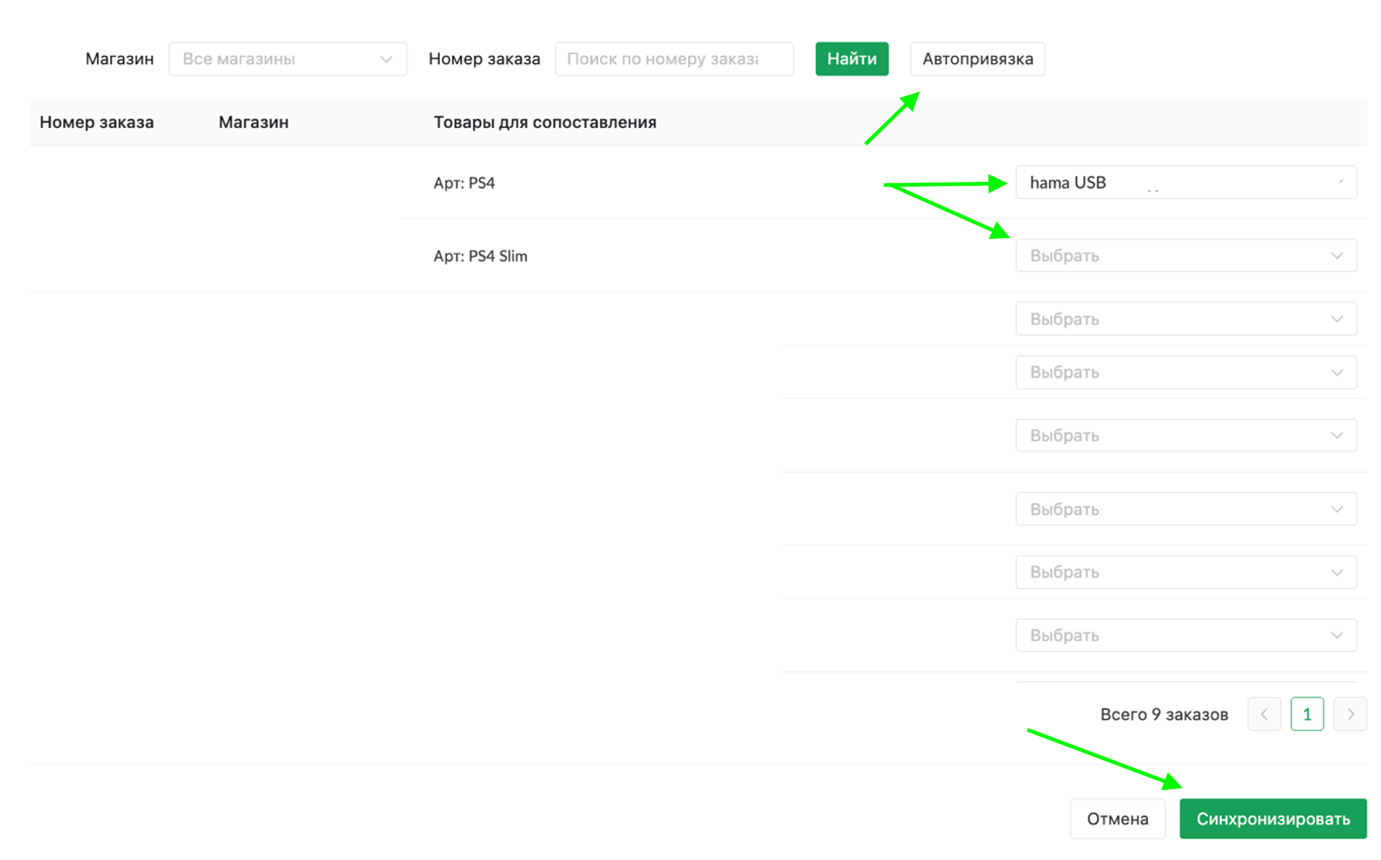 - Нажмите «автопривязка» и программа попытается автоматически сопоставить их по названию и артикулу.
