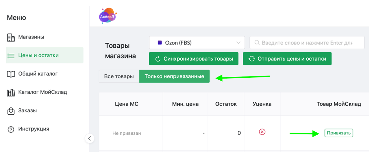 - Если автопривязке не удалось это сделать - переходим во вкладку "Только непривязанные" → находим нужный товар → нажимаем на кнопку "Привязать" в нужном товаре → выбираем артикул в МойСклад. Готово!