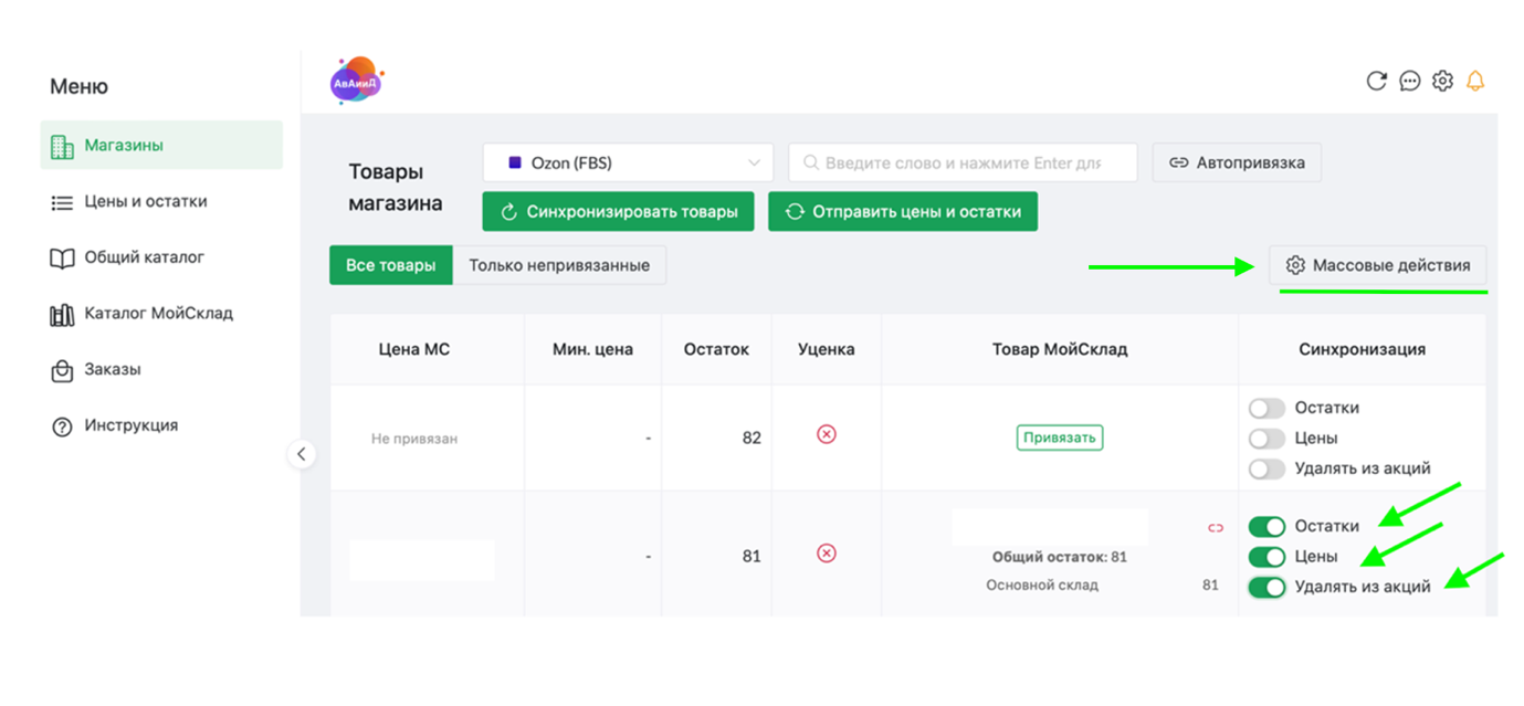 - Для частичного исключения товаров из акций Ozon, уберите в приложении рубильник с нужных товаров.