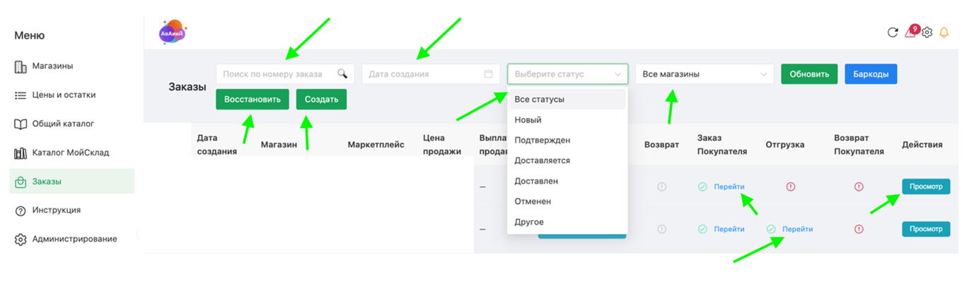Тут можно искать в поисковике заказ по номеру, смотреть заказы по дате создания или по статусу, а также выбирать один или несколько магазинов, в котором хотим найти заказ.